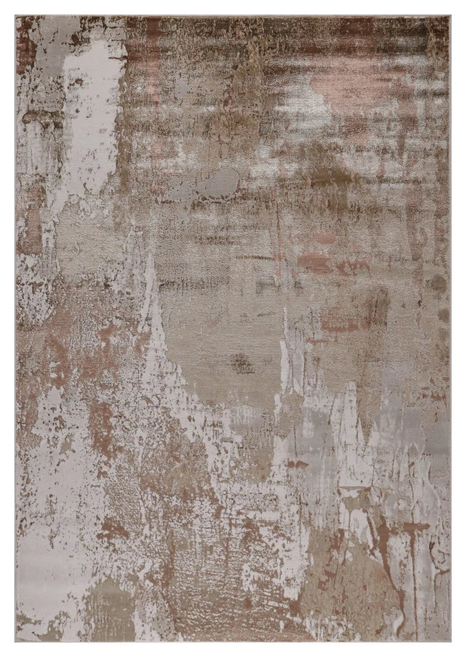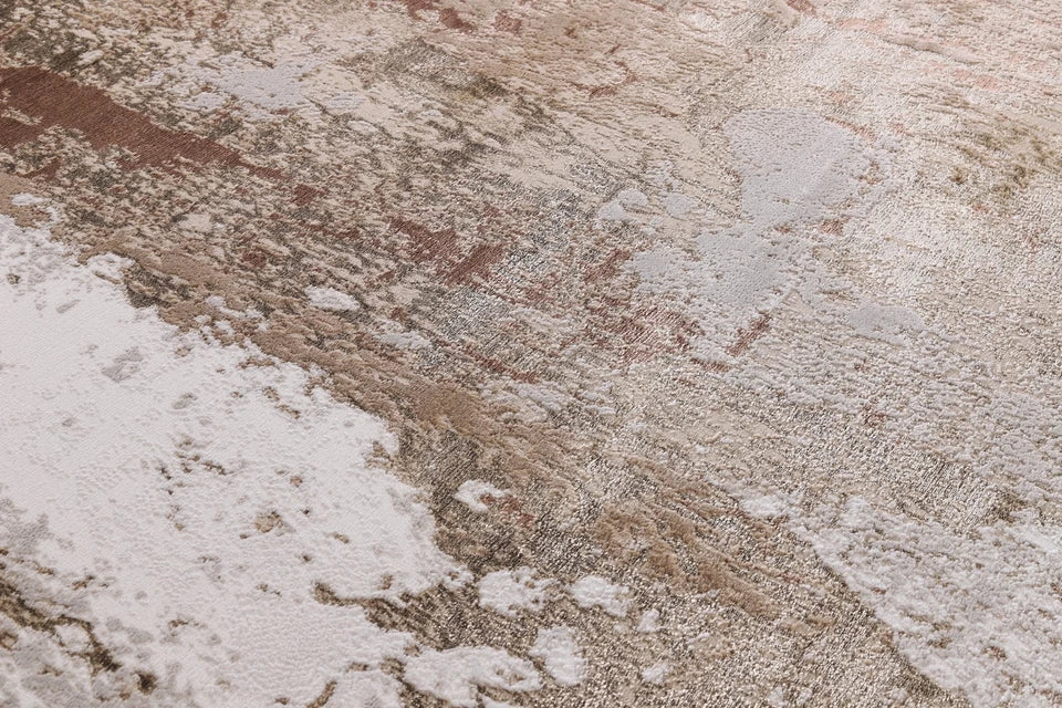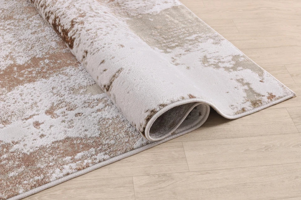 This modern area rug features a marble-inspired abstract pattern with a distressed finish, creating depth, movement, and a warm, sophisticated appeal,
