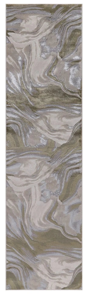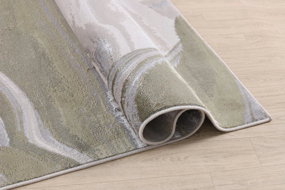 The metallic green, grey, and black tones blend effortlessly with both contemporary and traditional décor styles. Crafted from a durable 65% polyester and 35% polypropylene blend, this rug provides soft comfort underfoot while withstanding high-traffic areas. Ideal for your living room, dining area, bedroom, or hallway, it acts as a stylish centrepiece enhancing any space.