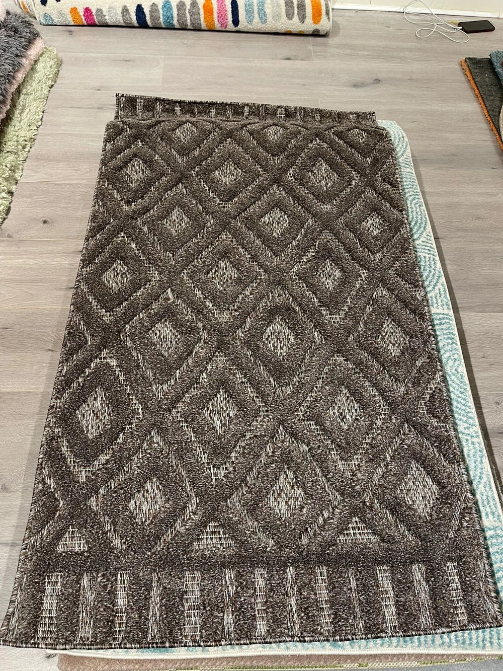 Contemporary Design: Geometric diamond pattern in charcoal for a stylish look.